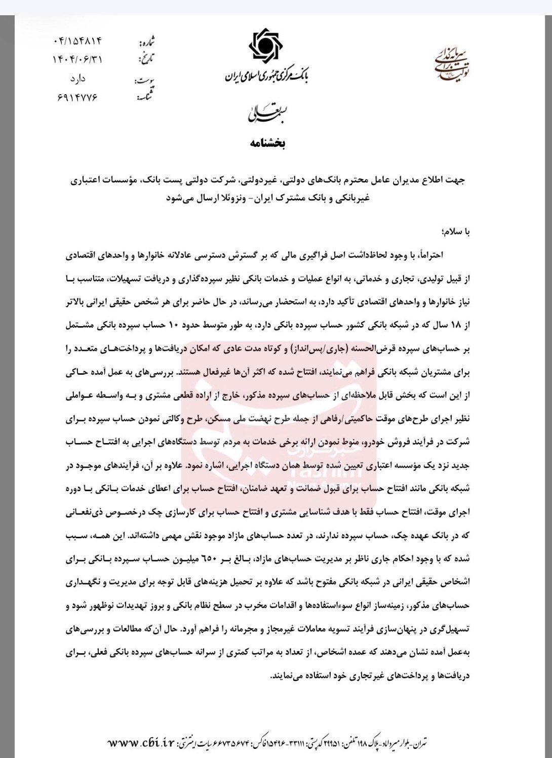 بخشنامه همچنین محدودیت جدی در افتتاح حساب برای کسانی که بیش از ۱۰ حساب فعال دارند یا حسابهایشان در سامانه سیاح «تعیینتکلیفنشده» باقی مانده، اعمال میکند.