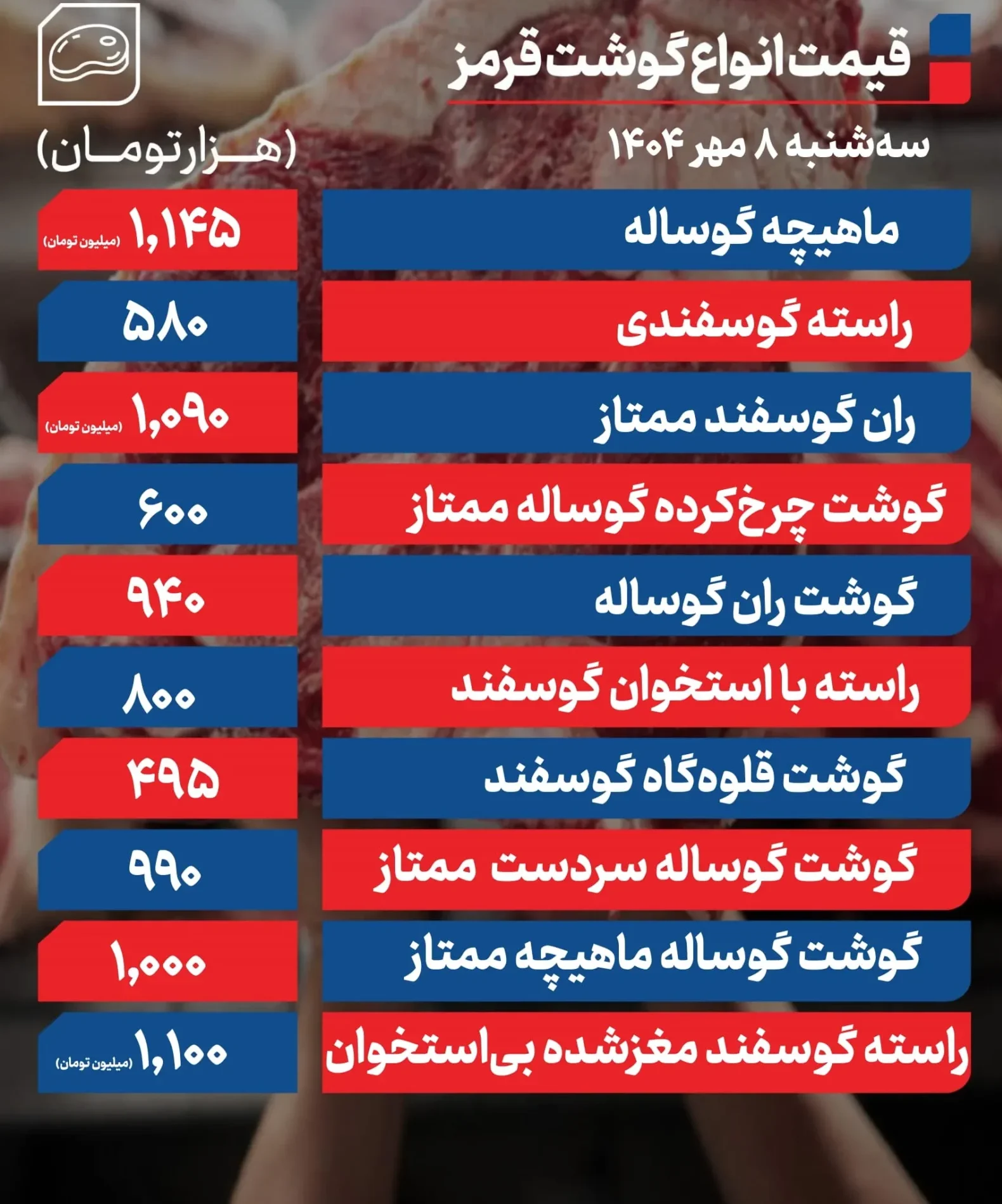 قیمت گوشت قرمز امروز 8 مهر ۱۴۰۴ اعلام شد.
