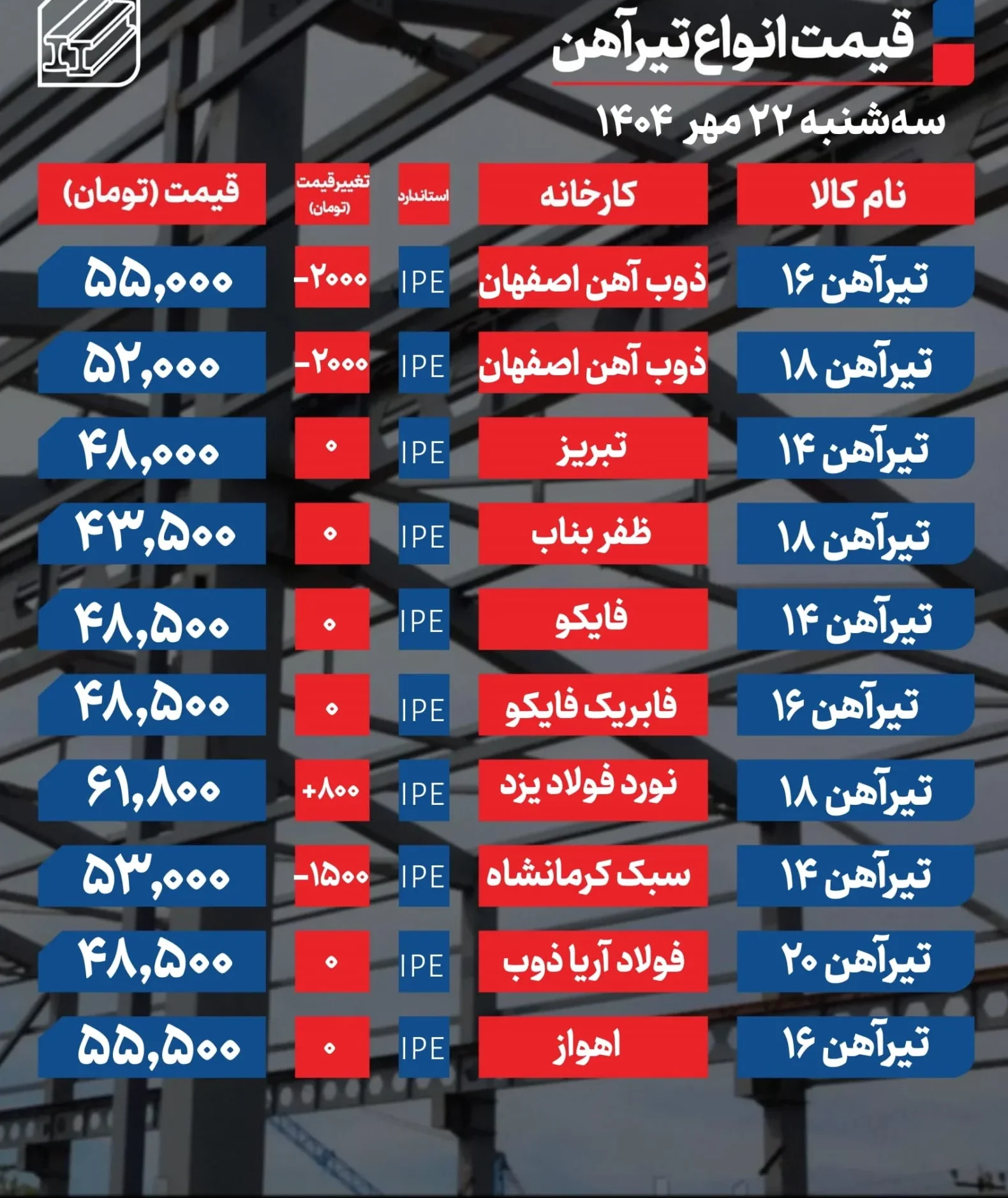 قیمت تیرآهن امروز ۲۲ مهر ۱۴۰۴ اعلام شد. بازار نوسان محدودی را تجربه می‌کند.
