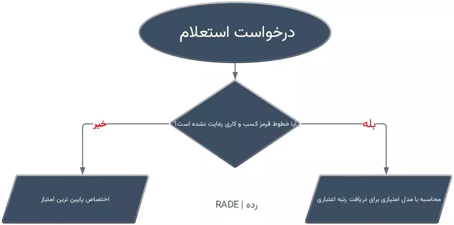 مجموعهای از قواعد وجود دارد که به آنها خط قرمز کسبوکاری گفته میشود و در بند قبلی به طور کامل توضیح داده شد. اگر فرد در این معیارها سابقهای داشته باشد، رتبه اعتبارسنجی او بهشدت کاهش خواهد یافت. در نمودار زیر، نمایی ساده از این موضوع ارائه شده است: