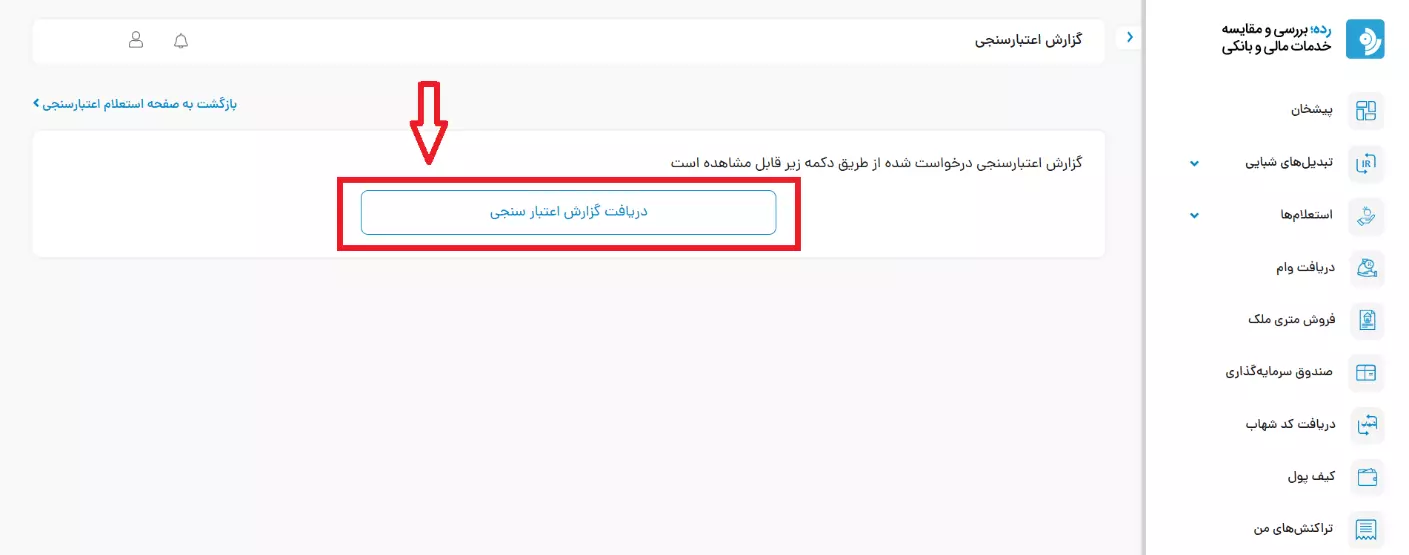۳.در این مرحله باید کد تایید پیامکشده را وارد کرده و بر روی گزینه «دریافت گزارش اعتبارسنجی» کلیک کنید.