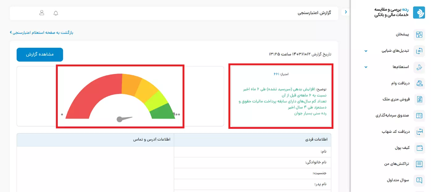 ۴.حالا گزارش اعتبارسنجی بانکی شما آماده است. همانطور که در تصویر زیر میبینید، مقدار امتیاز، توضیحات تکمیلی، نمودار وضعیت اعتبارسنجی و اطلاعات فردی در این صفحه قابل مشاهده است. همچنین، برای دریافت فایل کامل گزارش اعتبارسنجی بانک مرکزی باید بر روی گزینه «مشاهده گزارش» کلیک کنید تا فرآیند دانلود آغاز شود.