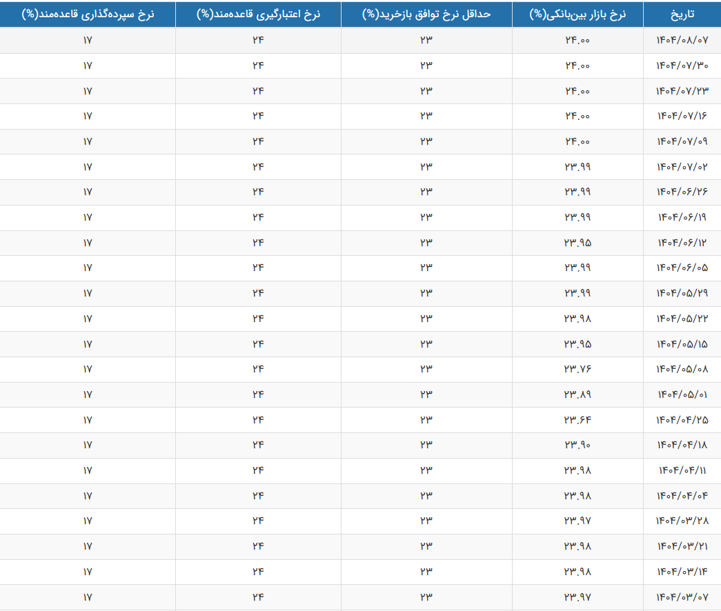 در همین بازه، نرخ اعتباریگیری قاعدهمند نیز در سطح ۲۴ درصد و نرخ سپردهگذاری قاعدهمند در ۱۷ درصد بدون تغییر باقی ماندهاند. ثبات همزمان این سه نرخ بیانگر آن است که بانک مرکزی در پاییز ۱۴۰۴ استراتژی «انجماد سیاستی» را برای حفظ کنترل تورم و جلوگیری از رشد ترازنامه بانکها دنبال میکند.