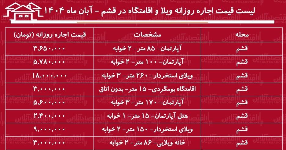 طبق تازهترین اطلاعات به دست آمده قیمت اجاره روزانه ویلا و اقامتگاه در قشم به شرح زیر است: