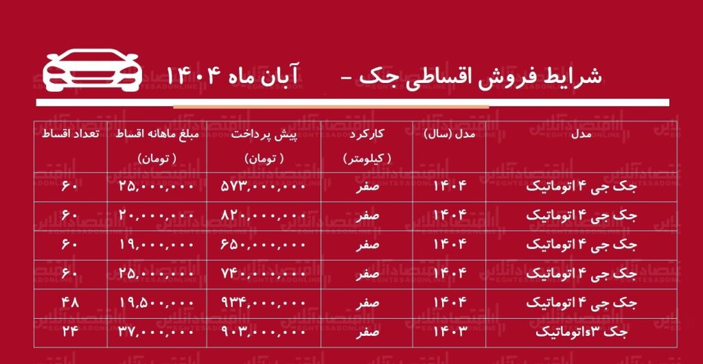 به گزارش راهبرد بانک،همچنین جک J4 نیز با پیشپرداخت ۸۲۰ میلیون تومان و اقساط ۲۰ میلیون تومانی در ۶۰ ماه عرضه میشود.