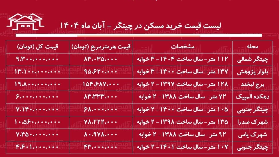 واحد دیگری در «چیتگر جنوبی» به متراژ ۱۰۵ متر دو خوابه با سال ساخت ۱۴۰۰، با قیمت ۷ میلیارد و ۱۴۰ میلیون تومان معامله میشود. همچنین، یک واحد ۱۳۷ متری سه خوابه با سال ساخت ۱۴۰۰ در «بلوار پژوهش» ۱۳ میلیارد و ۱۰۰ میلیون تومان قیمتگذاری شده است.