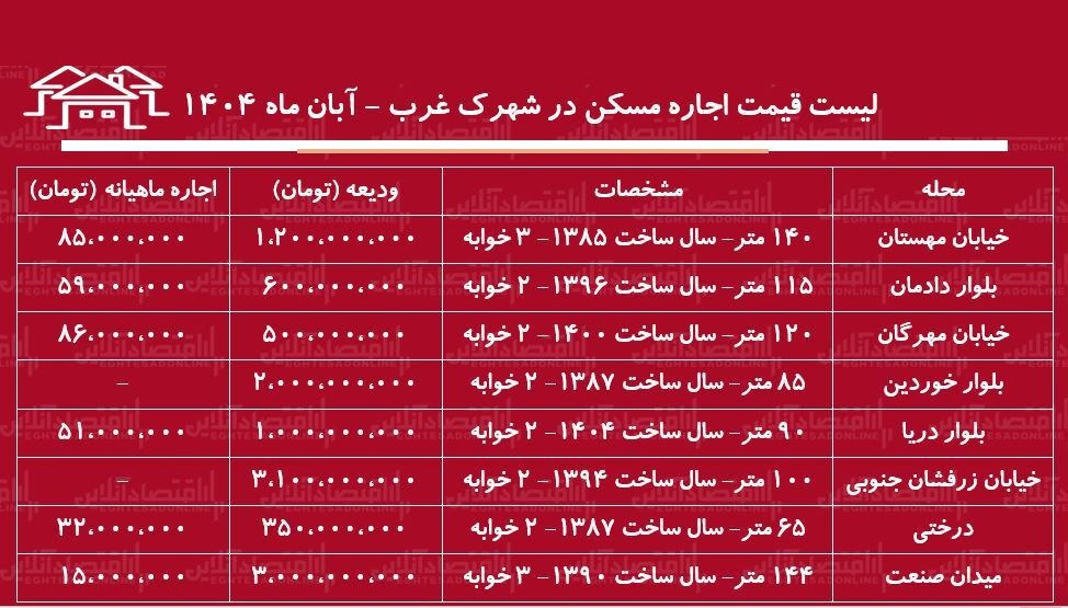طبق آخرین اطلاعات به دست آمده از بازار مسکن تهران در شهرک غرب ، یک واحد ۹۰ متری دو خوابه با سال ساخت ۱۴۰۴، در «بلوار دریا» با ودیعه ۱ میلیارد تومان و اجاره ماهیانه ۵۱ میلیون تومان عرضه میشود.