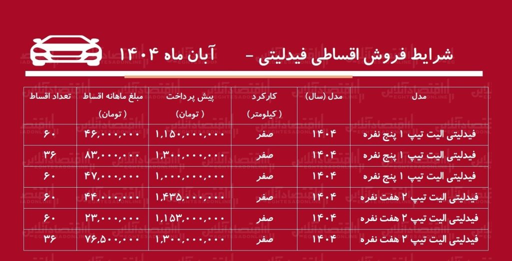 در طرحی دیگر، فیدلیتی الیت تیپ ۱ پنجنفره با پیشپرداخت یک میلیارد و ۳۰۰ میلیون تومان و اقساط ۳۶ماهه ماهیانه ۸۳ میلیون تومان عرضه میشود که با وجود مبلغ قسط بالاتر، دوره بازپرداخت کوتاهتر دارد و برای خریداران نقدینگیدار قابل توجه است.