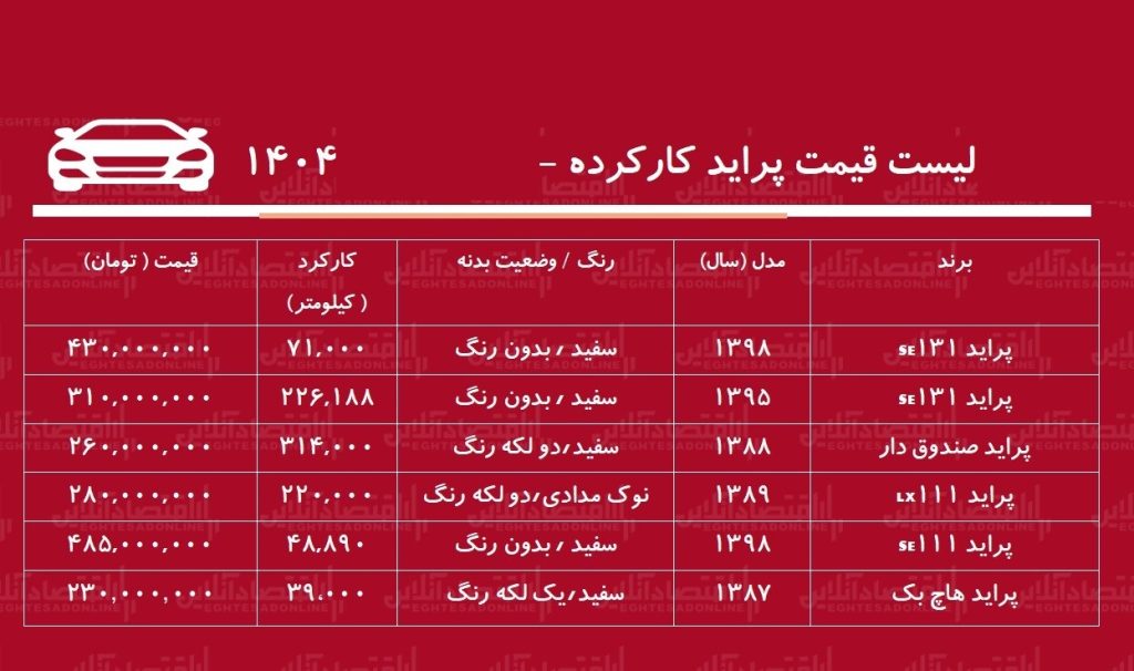 به گزارش راهبرد بانک، بر اساس آگهیهای پراید کارکرده، پراید ۱۳۱ سال ۱۳۹۸ با کارکرد ۷۱ هزار کیلومتر و بدون رنگ، ۴۳۰ میلیون تومان قیمتگذاری شده و در حال حاضر یکی از گرانترین نمونههای موجود میان مدلهای اقتصادی محسوب میشود.