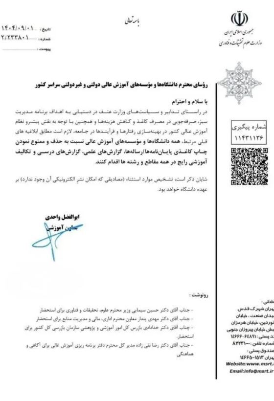 به گزارش راهبرد بانک،وزارت علوم، تحقیقات و فناوری، ممنوعیت چاپ کاغذی پایاننامهها، رسالهها، گزارشهای علمی و تکالیف درسی از سوی دانشگاهها و مراکز آموزش عالی را ابلاغ کرد.