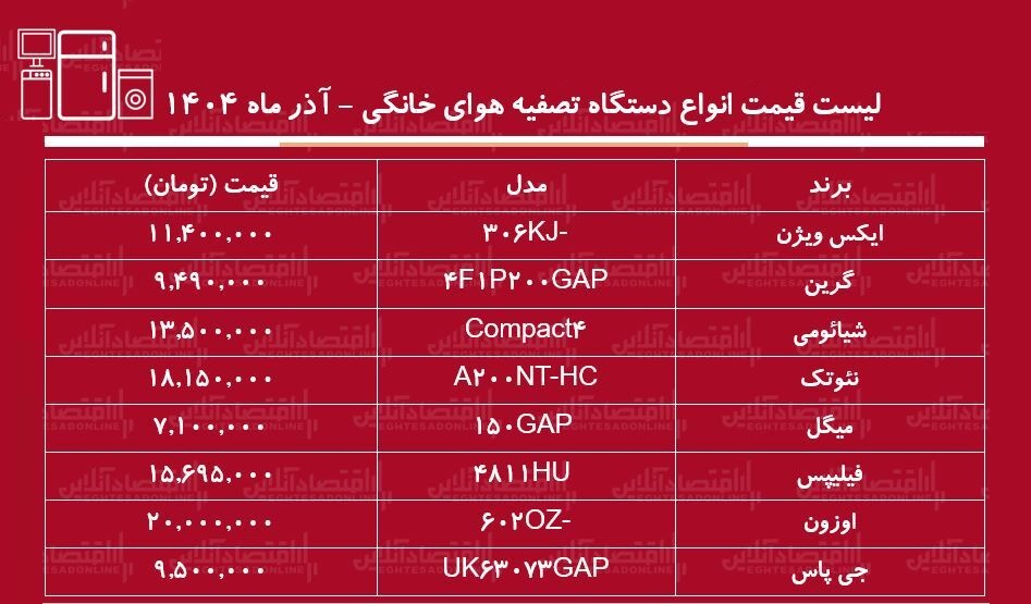 دستگاه تصفیه هوای «فیلیپس مدل HU ۴۸۱۱» با قیمت ۱۵ میلیون و ۶۹۵ هزار تومان عرضه می‌شود. همچنین، دستگاه تصفیه هوای «شیائومی مدل ۴Compact» با قیمت ۱۳ میلیون و ۵۰۰ هزار تومان به فروش می‌رسد.