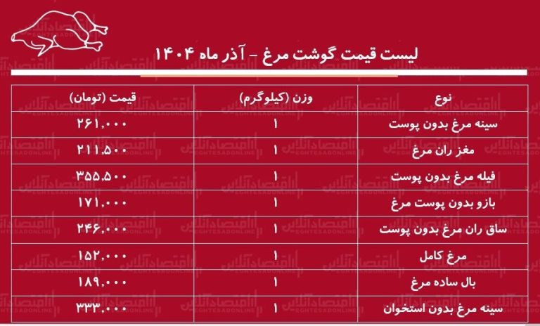 قیمت هر کیلوگرم «مرغ کامل» نیز در بازار به ۱۵۲ هزار تومان رسیده است. «مغز ران مرغ» به ازای هر کیلوگرم با قیمت ۲۱۱ هزار و ۵۰۰ تومان در دسترس مصرفکنندگان قرار دارد.