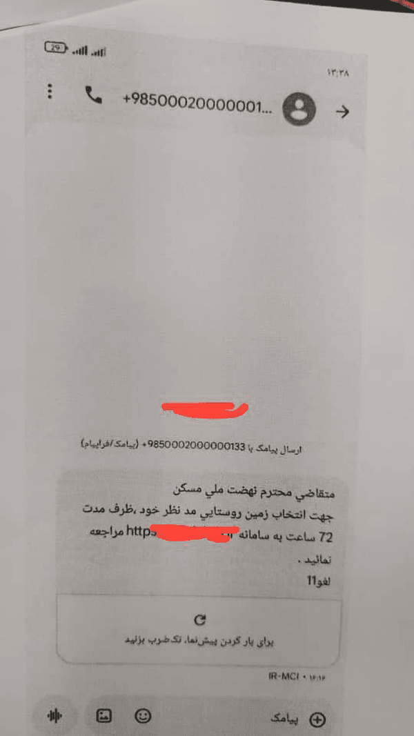 به گزارش راهبرد بانک،در ۴۸ ساعت گذشته با تعلل یکی از شرکتهای ارائه دهنده خدمات پیامکی و عدم بررسی محتوای پیام توسط اپراتور مربوطه، پیامک جعلی در خصوص انتخاب زمین روستایی در طرح نهضت ملی مسکن برای برخی از شهروندان ارسال شده که از سوی کلاهبرداران است؛ این خبر را رئیس پلیس فتا پایتخت سردار داود معظمی گودرزی میگوید.