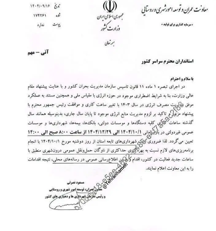 به گزارش راهبرد بانک، به نقل از دیده بان ایران؛ معاونت عمران و توسعه امور شهری و روستایی وزارت کشور در مکاتبه با استانداران ساعت کاری کلیه دستگاهها و مؤسسات دولتی، بانکها، بیمهها شهرداریها و مؤسسات عمومی غیردولتی در بازه زمانی اول دیماه ۱۴۰۴ تا ۲۹ اسفندماه ۱۴۰۴ را از ساعت ۸ صبح تا ۱۴ تعیین کرد.