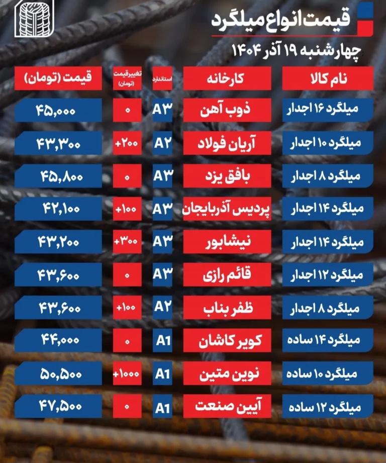 به گزارش راهبرد بانک،قیمت میلگرد امروز ۱۹ آذر ۱۴۰۴ اعلام شد. بازار میلگرد امروز در حالی حرکت خود را آغاز کرد که نشانههایی از افزایش تحرکات معاملاتی نسبت به روزهای قبل دیده میشود، هرچند قیمتها در اغلب مبادی در وضعیت ثابت باقی ماندهاند. این ثبات در ظاهر، نتیجه توازن نسبی میان عرضه و تقاضاست؛ اما در لایههای زیرین بازار، تغییراتی قابل مشاهده است که میتواند جهت نرخها را در روزهای آینده تحتتأثیر قرار دهد.