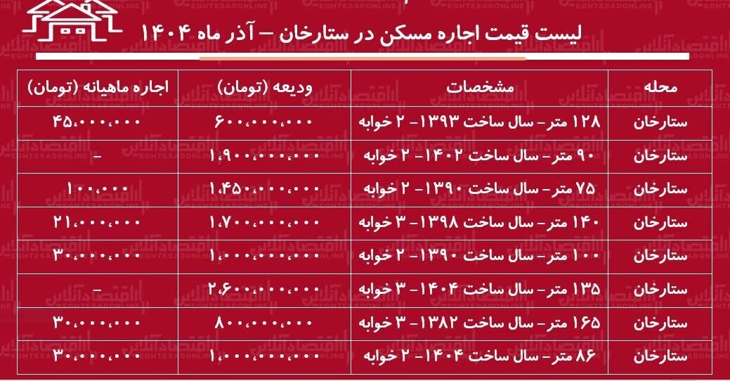 به گزارش راهبرد بانک، طبق آخرین نرخ‌های اعلام شده در بازار مسکن تهران قیمت اجاره مسکن در ستارخان به شرح زیر است: