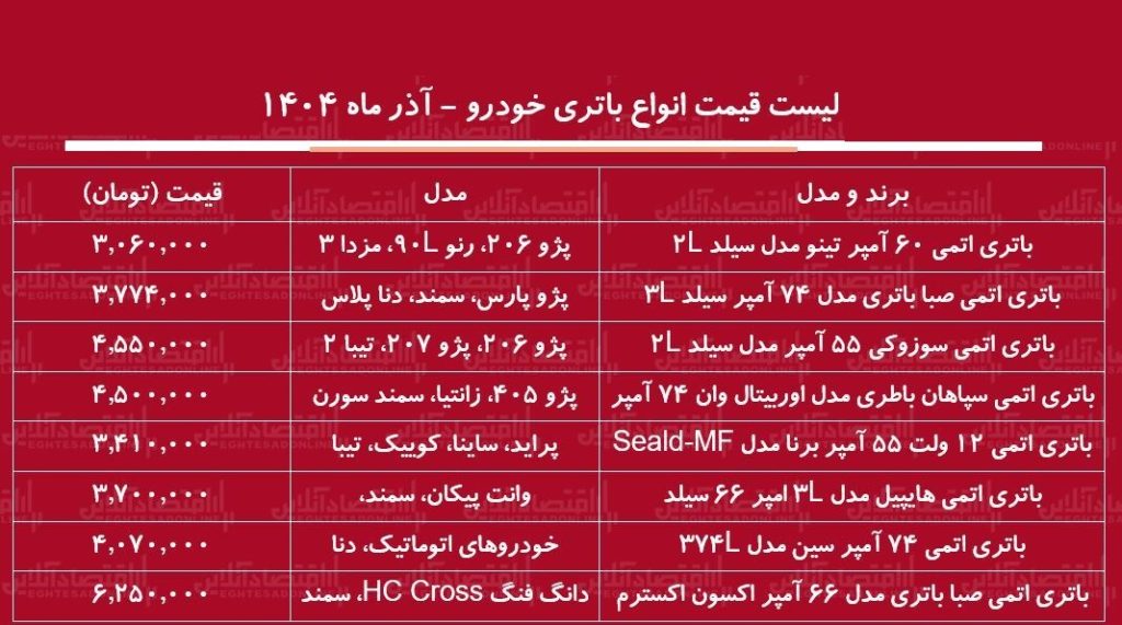 بررسی آخرین نرخ‌های موجود در بازار نشان می‌دهد که فاصله قیمتی میان باتری‌های ۵۵، ۶۰، ۶۶ و ۷۴ آمپر به‌ شکل قابل‌ توجهی افزایش یافته و برندهای مختلف در کلاس‌های متفاوت قیمتی عرضه می‌شوند.