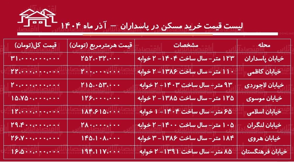 این ارقام نشان میدهد پاسداران همچنان یکی از گرانترین مقاصد خرید مسکن در تهران باقی مانده و ورود به این بازار نیازمند سرمایهای قابلتوجه است.