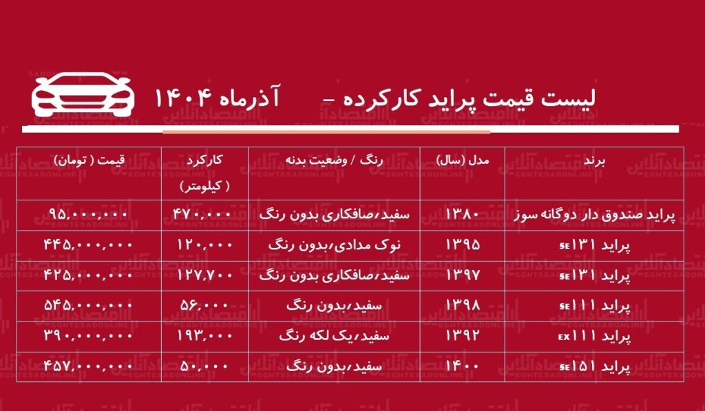 قیمت پراید ۱۳۱ SE مدل ۱۳۹۵ با کارکرد ۱۲۰ هزار کیلومتر و بدنه بدون رنگ، به حدود ۴۴۵ میلیون تومان رسیده؛ خودرویی که به دلیل سلامت ظاهری و استهلاک کمتر، همچنان تقاضای بالایی دارد.
