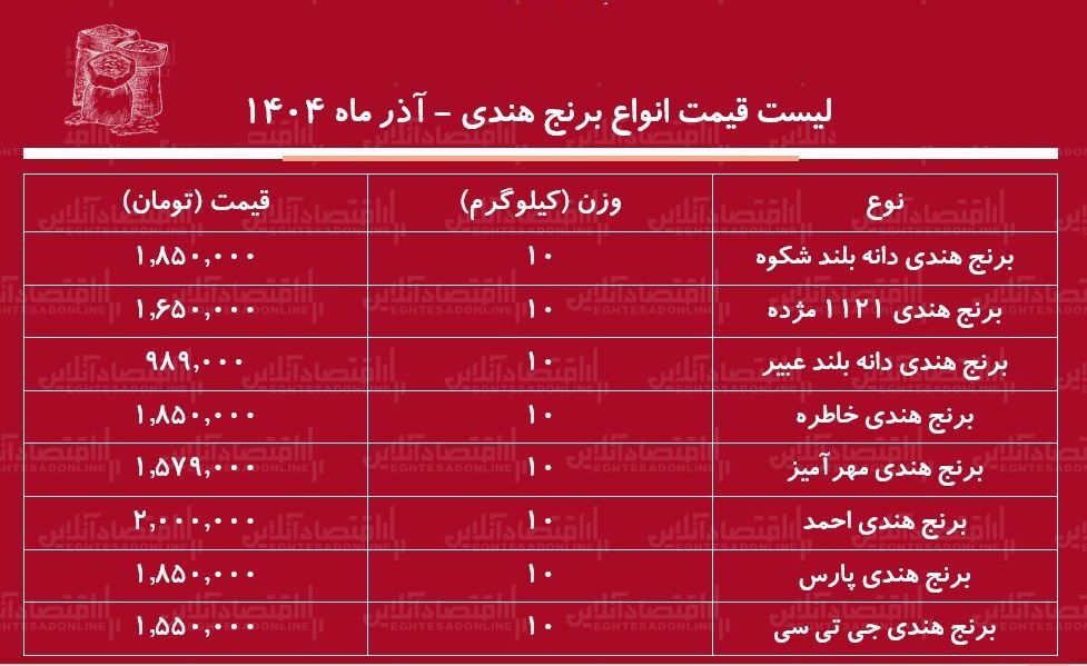 همچنین، «برنج هندی مهرآمیز» به ازای هر ۱۰ کیلوگرم با قیمت ۱ میلیون و ۵۷۹ هزار تومان به فروش میرسد. قیمت «برنج هندی احمد» نیز برای هر ۱۰ کیلوگرم ۲ میلیون تومان تعیین شده است.