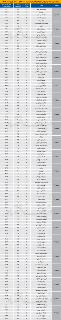 متوسط «قیمت‌ پیشنهادی» فروش آپارتمان در مناطق ۲۲‌گانه شهر تهران در پایان آذرماه در سطح مترمربعی ۱۰۸‌میلیون و ۳۰۰‌هزار‌تومان قرارگرفت. میانگین قیمت در آذر فقط ۰.۴‌درصد نسبت به آبان افزایش پیدا کرده‌است که این تورم ماهانه در مقایسه با رشد ۲.۷‌درصدی در آبان و ۲.۹‌درصدی در مهر، بیانگر «تمایل بازار مسکن به ثبات قیمت» است.