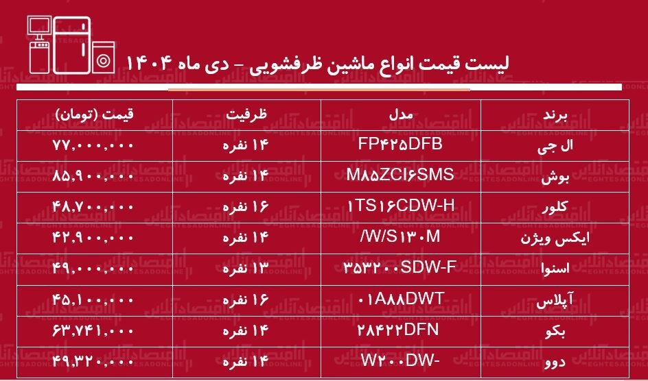 ماشین ظرفشویی «ال جی مدل DFB۴۲۵FP» با ظرفیت ۱۴ نفره، با قیمت ۷۷ میلیون تومان در دسترس خریداران قرار دارد. همچنین، قیمت ماشین ظرفشویی «بوش مدل SMS۶ZCI۸۵M» با ظرفیت ۱۴ نفره در بازار ۸۵ میلیون و ۹۰۰ هزار تومان تعیین شده است.
