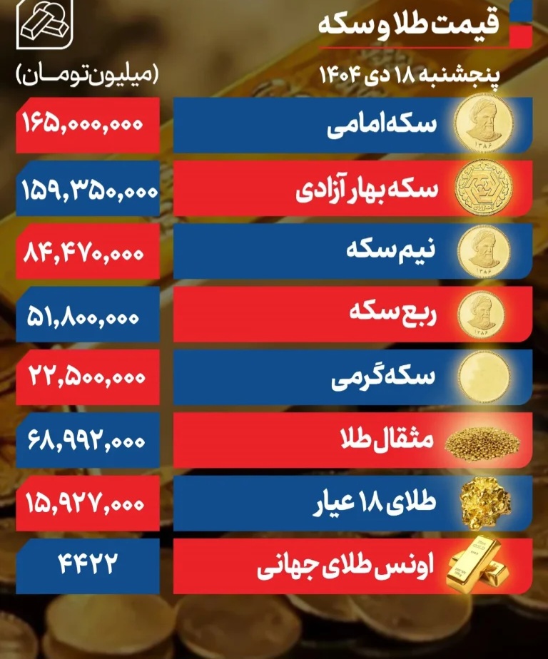 به گزارش راهبرد بانک،قیمت طلا و سکه امروز پنجشنبه ۱۸ دی ۱۴۰۴ در روند نزولی بازگشایی شد. قیمت طلا کاهش داشت و طلای ۱۸ عیار به کانال ۱۵.۹ میلیونی سقوط کرد. قیمت سکه نیز در تمامی قطعات غیر از سکه گرمی ریزش کرد و سکه امامی به سطح ۱۶۵ میلیونی برگشت.