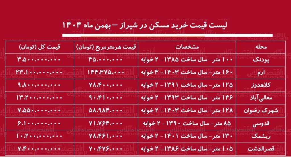 اختلاف قیمت هر مترمربع مسکن در شیراز، حتی در فاصلهای کوتاه بین محلهها، به بیش از ۱۰۰ میلیون تومان میرسد؛ موضوعی که بیانگر شکاف عمیق بین بازار مصرفی و بازار لوکس این کلانشهر است.