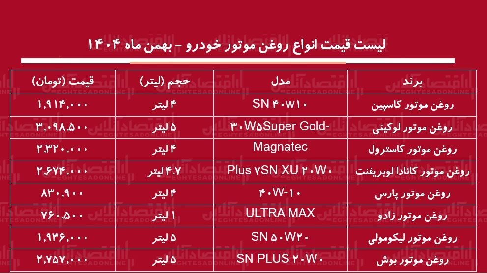 قیمت انواع روغن موتور خودرو بهمن ۱۴۰۴