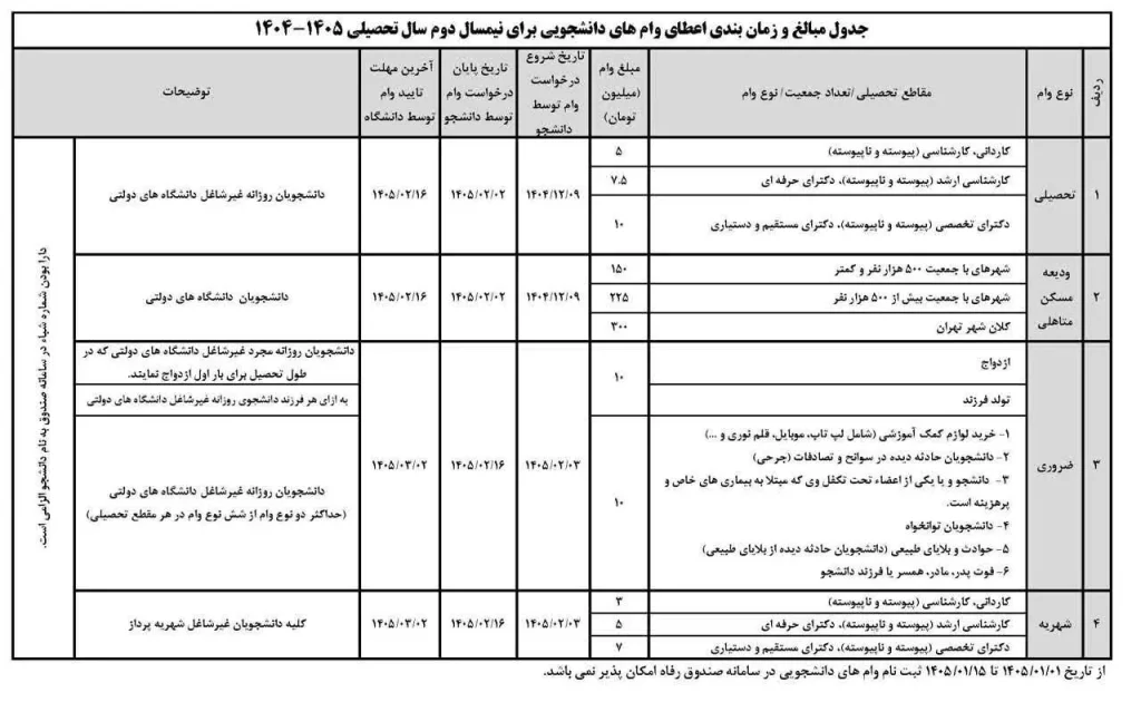 دانشجویان متقاضی دریافت وام ودیعه مسکن متاهلی در تمامی مقاطع تحصیلی نیز می‌توانند از شنبه، ۹ اسفندماه ۱۴۰۴ تا پایان اسفند و همچنین از ۱۶ فروردین تا ۲ اردیبهشت برای ثبت‌نام اقدام کنند.
