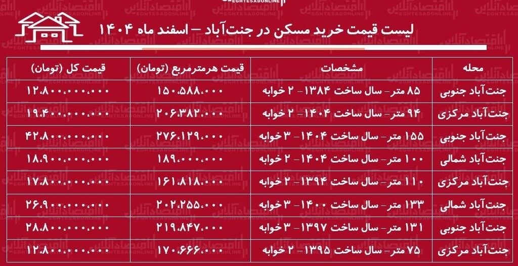 لیست قیمت خرید مسکن در جنت‌آباد / قیمت هر متر آپارتمان در این منطقه چقدر است؟ + جدول اسفند ماه ۱۴۰۴